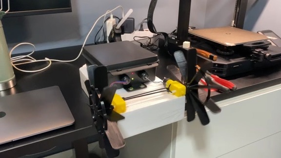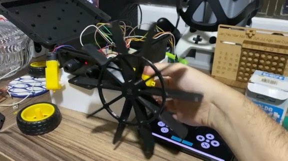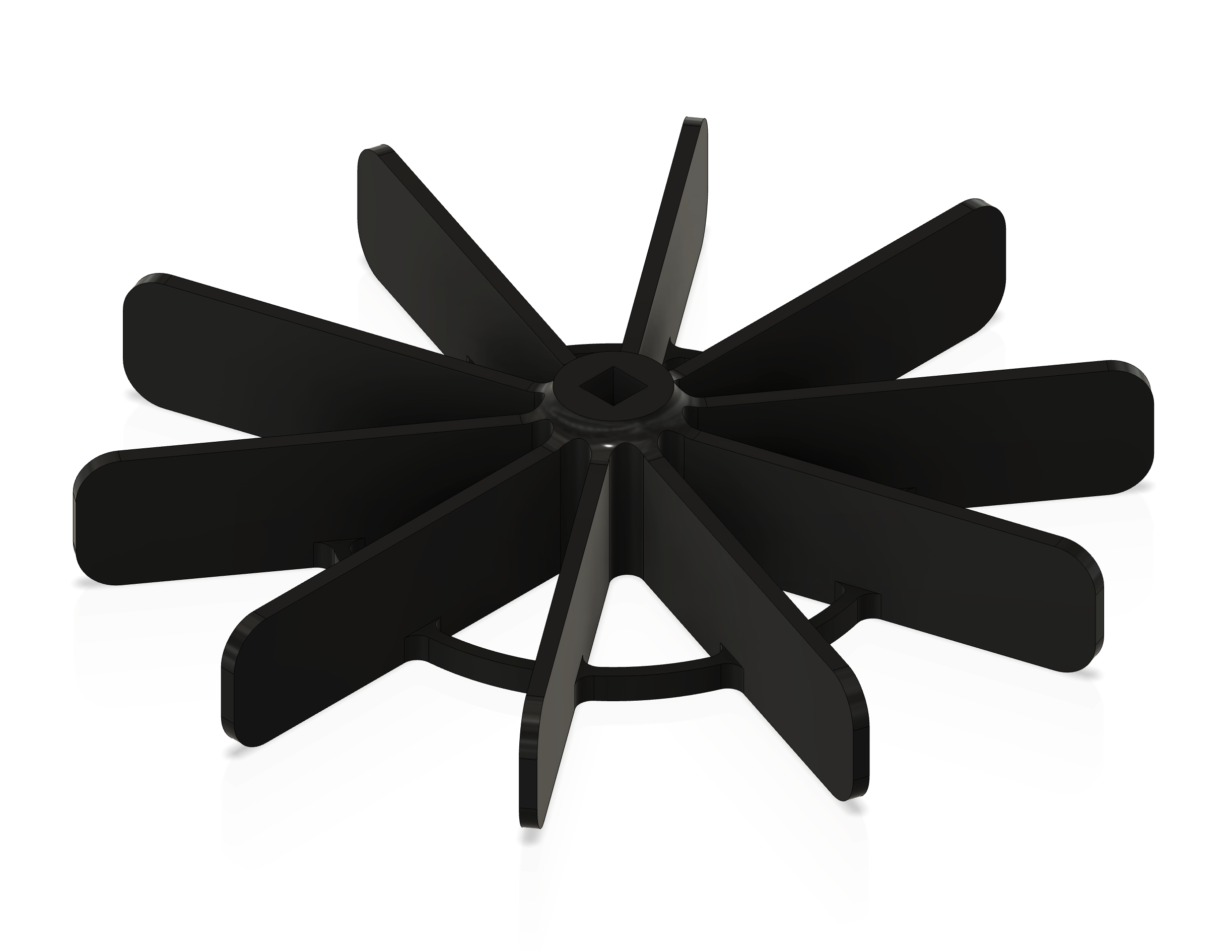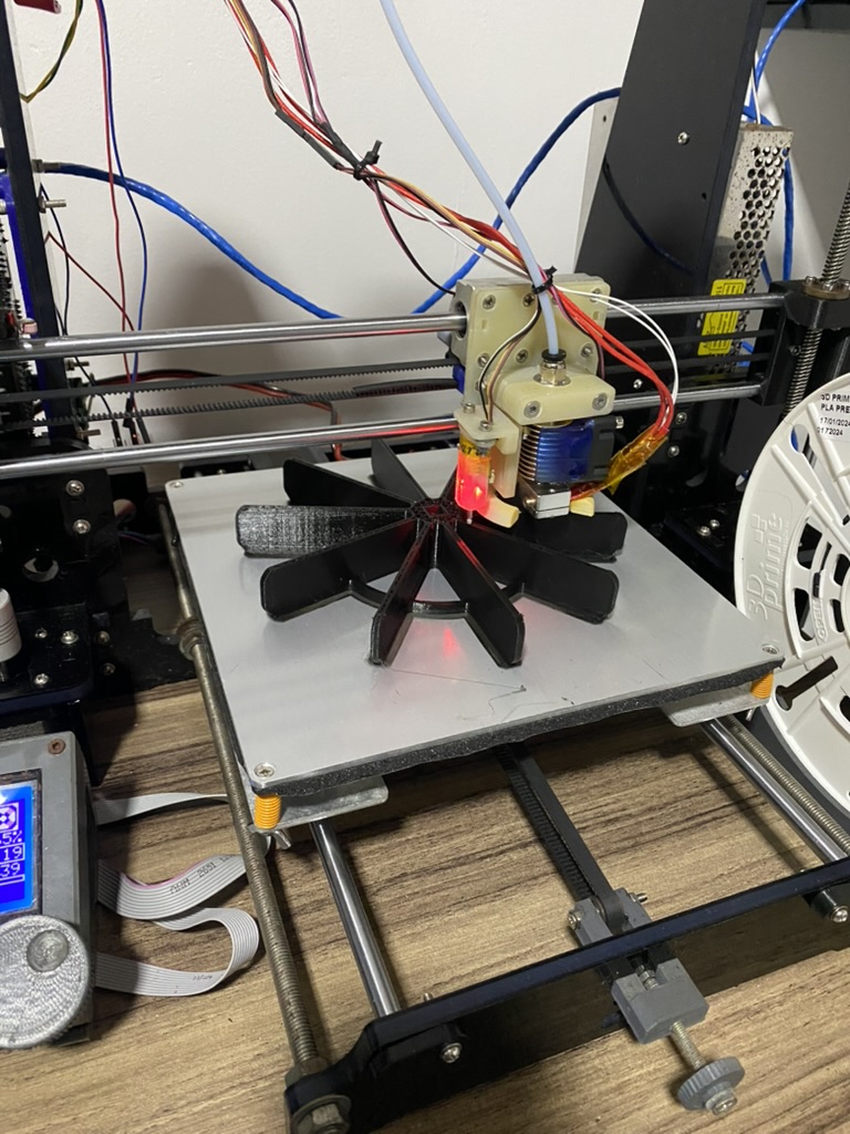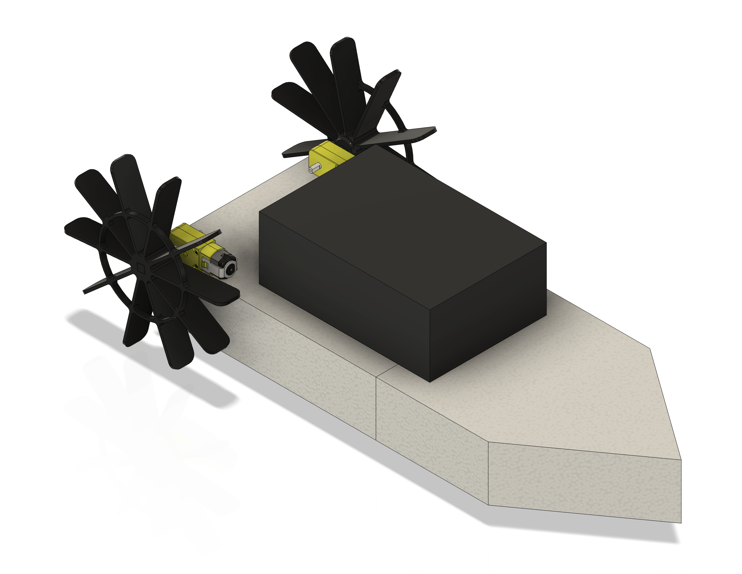 The paddles had to be large enough to reach the water from their mounting position, but light enough not to overwhelm the geared motors' limited torque. I settled on an 8-blade radial design modeled in Fusion. I printed the first paddle myself, but ran out of filament for the second one — my brother-in-law Diego kindly printed it for me.