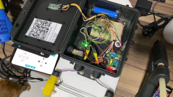 The boat is controlled via Bluetooth from a smartphone app running in gamepad mode. It uses differential steering — two independent geared motors, each driving a paddle wheel on one side. To go forward, both motors spin. To turn, only one motor runs. The body is made of plastic and styrofoam, with all the electronics housed inside a waterproof plastic enclosure.