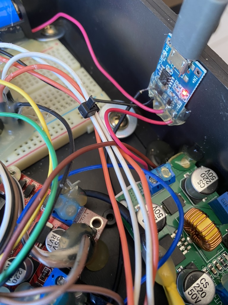 To solve the power problem, I replaced the 9V battery with a 2200 mAh 18650 lithium cell. This required adding a TP4056 charging module (for USB recharging), an LM2587 step-up boost converter (to raise the voltage), and swapping the bulky L298N for a compact DRV8833 motor driver.