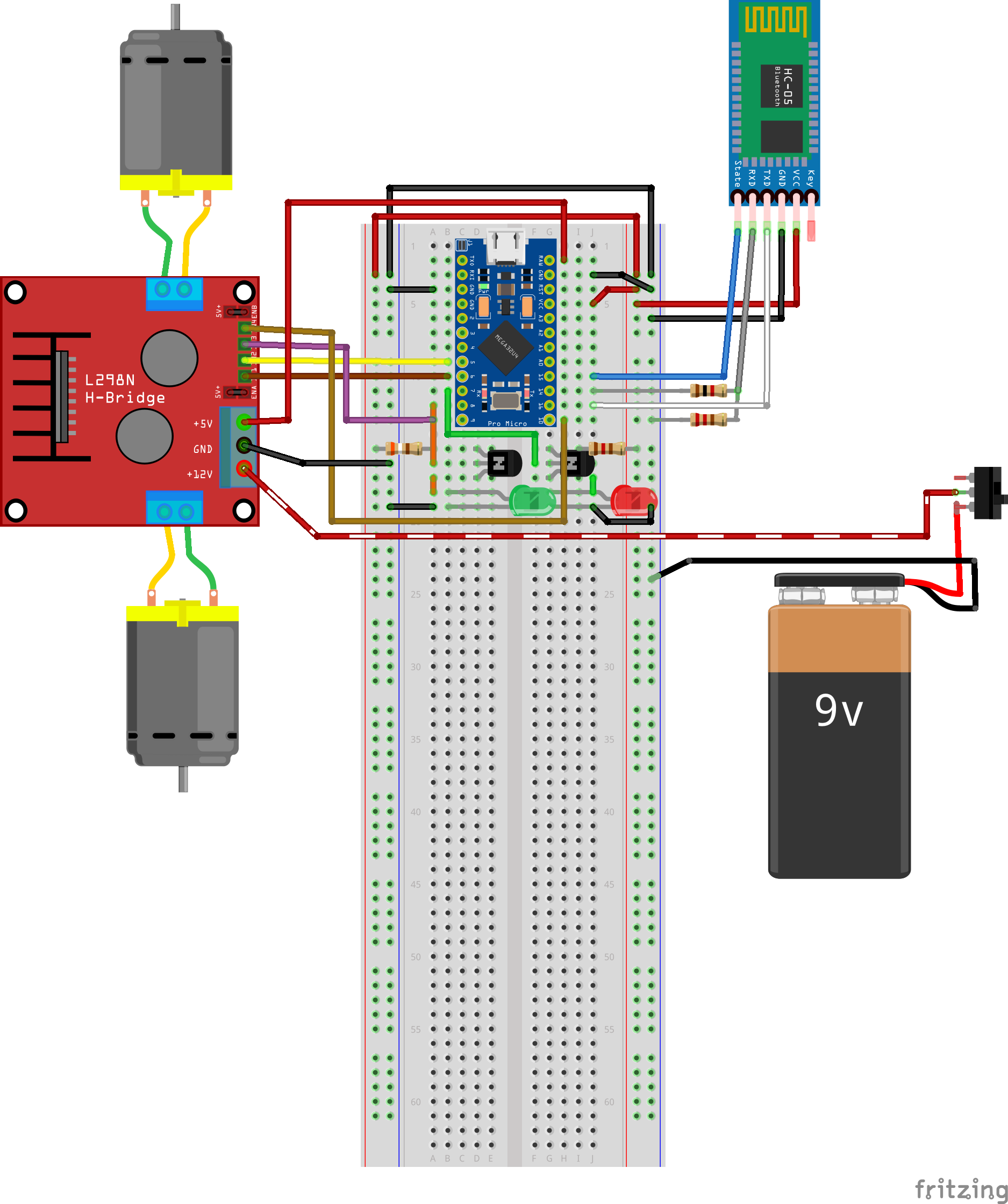 The first version used an Arduino Pro Micro, an HC-05 Bluetooth module, an L298N H-bridge motor driver, and a 9V battery. I also added two LEDs — one to indicate the board was powered on, and another to show the Bluetooth connection status.